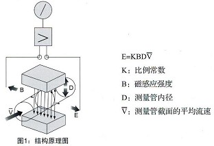電磁流量計測量原理是基于法拉第電磁感應定律。流量計的測量管是一內(nèi)襯絕緣材料的非導磁合金短管。兩只電極沿管徑方向穿通管壁固定在測量管上。其電極頭與襯里內(nèi)表面基本齊平。勵磁線圈由雙向方波脈沖勵磁時,將在與測量管軸線垂直的方向上產(chǎn)生一磁通量密度為B的工作磁場。此時,如果具有一定電導率的流體流經(jīng)測量管,將切割磁力線感應出電動勢E。電動勢E正比于磁通量密度B、測量管內(nèi)徑d與平均流速V的乘積,電動勢E(流量信號)由電極檢出并通過電纜送至轉(zhuǎn)換器。轉(zhuǎn)換器將流量信號放大處理后,可顯示流體流量,并能輸出脈沖,摸擬電流等信號,用于流量的控制和調(diào)節(jié)。