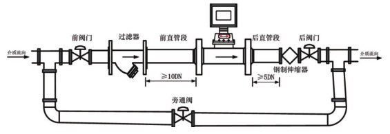 5、流量計應水平安裝。建議在流量計后直管段后側安裝鋼制伸縮器(補償器),伸縮器必須符合管道設計的公稱通徑和公稱壓力的要求。伸縮器是作為管道應力的補償及方便流量計的安裝與拆卸。