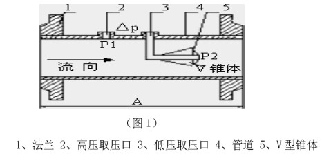 V錐流量計(jì)是一種差壓流量儀表,迄今為止以差壓原理設(shè)計(jì)的流量儀表已經(jīng)有一百多年的應(yīng)用歷史了。差壓原理是基于密封管道中的能量轉(zhuǎn)換原理,也就是說對穩(wěn)定流體,流量與管道中介質(zhì)流速的平方根成正比。圖一所示當(dāng)介質(zhì)接近錐體時(shí),其壓力為P1,在介質(zhì)通過錐體的截流區(qū)時(shí),速度增大,壓力降低為P2,P1和P2都通過錐形流量計(jì)的取壓口引到差壓變送器上,當(dāng)流速發(fā)生變化時(shí),錐形流量計(jì)的兩個(gè)取壓口之間的差壓值會增大或縮小。