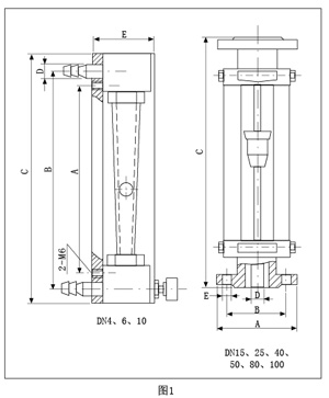 ZH-LZB/LZB-( )F流量計(jì)的錐管為光滑內(nèi)壁管(見圖4),通徑DN15以上的流量計(jì),浮子通過導(dǎo)桿 上下移動,保持穩(wěn)定;ZH-LZJ/LZJ-( )F流量計(jì)錐管 內(nèi)壁有三條導(dǎo)向凸筋,使浮子保持穩(wěn)定(見圖4)。通徑DN10以下的流量計(jì)采用軟管連接,配有針形流量調(diào)節(jié)閥;通徑DN15以上流量計(jì)采用法蘭連接。