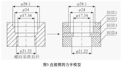 隨著內徑的變化,連接管實際上是由多個僅承受內壓的圓筒堆積而成,如圖3所示,自上而下,連接管可以近似看作是由內徑分別為¢18.1mm¢24mm、¢17.34mm、¢21.22mm4個圓筒粘接而成。