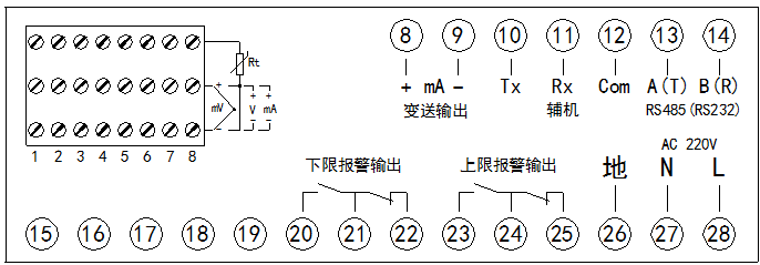 報警輸出:(1)1-64通道統(tǒng)一上下限報警,繼電器輸出觸點容量 AC220V/3A