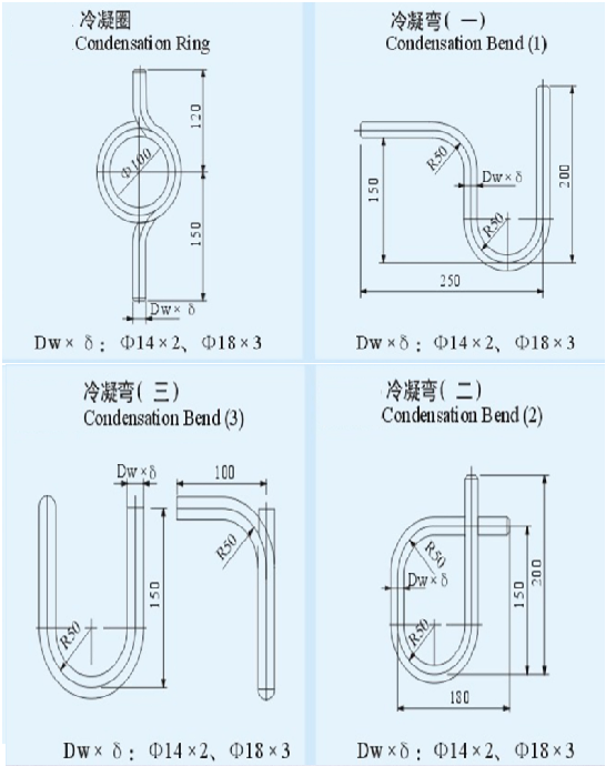 4、壓力表冷凝彎管規格:碳鋼材質為φ18×3無縫鋼管;不銹鋼材質為φ14×2或者φ14×3無縫鋼管